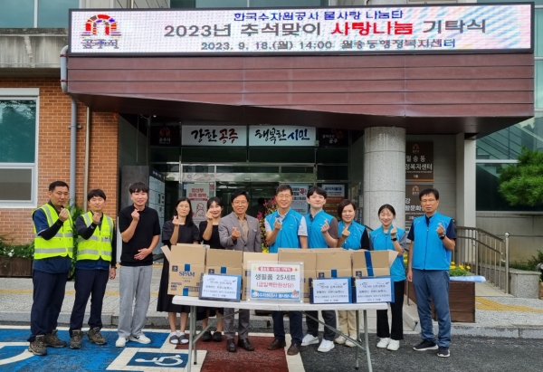 [충청뉴스큐] 한국수자원공사 충남중부권지사 공주수도운영센터는 추석 명절을 앞두고 지난 18일 공주시 월송동에 100만원 상당의 생필품을 전달했다.