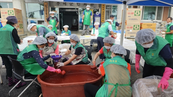 오늘 행사에는 박진완 군 협의회장, 이창순 군 부녀회장을 비롯해 16개 읍·면 회장단 등 40여명이 아침 일찍부터 모여 고추장 1,700ℓ를 담그고 850여통에 포장을 했다.