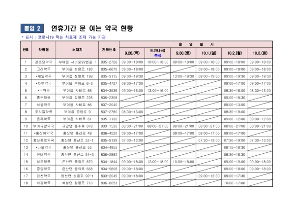 추석 연휴기간 문 여는 병·의원 및 약국, 선별진료소의 자세한 운영 일정은 중앙응급의료센터 홈페이지, 부여군청·부여군보건소 홈페이지, 보건복지콜센터, 스마트폰 앱 등을 통해 확인할 수 있다.