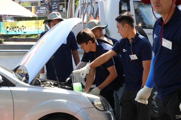 부여지역 자동차전문정비사업조합원으로 구성된 카포스 전문정비요원들은 전기장치, 타이어 공기압 등 자동차 상태를 상세하게 점검해 무상점검표를 작성하고 엔진오일이나 브레이크오일 워셔액, 냉각수, 와이퍼 등 간단한 소모품은 무상으로 교체하거나 보충해 줬다.