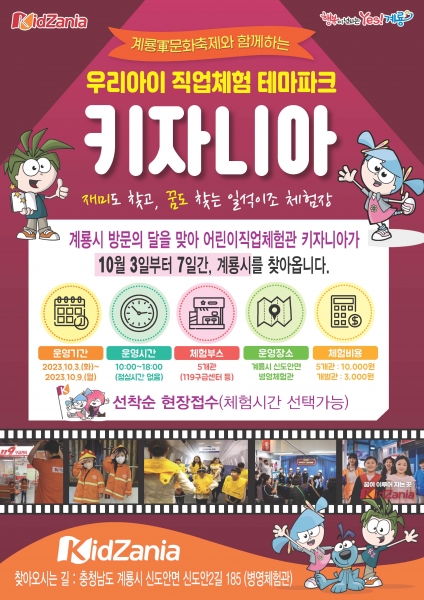 [충청뉴스큐] 계룡시는 글로벌 직업체험 테마파크로 어린이들에게 선풍적인 인기를 모으고 있는 ‘키자니아 GO’를 계룡병영체험관에서 10월 3일부터 9일까지 7일간 운영한다고 밝혔다.