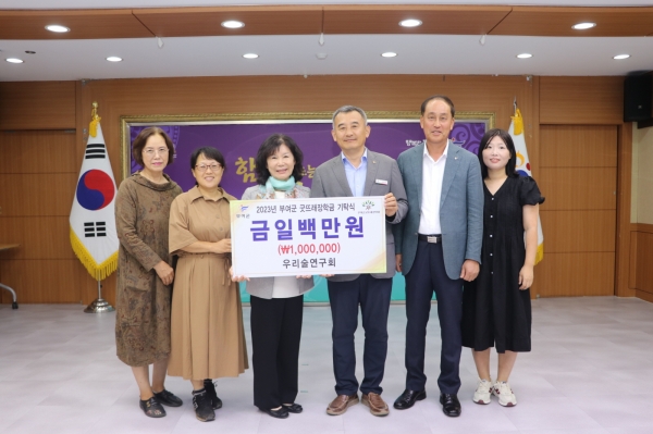 [충청뉴스큐] 우리술연구회는 지난 4일 부여군청을 방문해 장학금 100만원을 부여군굿뜨래장학회에 기탁했다.