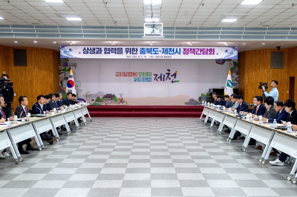 [충청뉴스큐] 10월 5일 오전 8시 제천시청 청풍호실에서 충청북도 주관으로 김영환 도지사와 도 문화체육관광국장 그리고 김창규 제천시장과 채홍경 부시장을 비롯한 관계 공무원, 충북도의회 김호경, 김꽃임 의원, 제천시의회 이정임 의장과 시의원들이 참석해 제천시의 현안사업 논의를 위한 정책간담회를 개최했다.