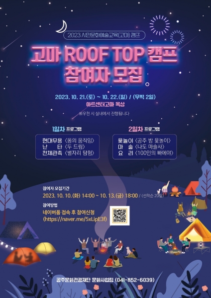 [충청뉴스큐] 공주문화관광재단이 가을을 맞아 가족과 함께 참여할 수 있는 문화예술교육 ‘고마 Roof Top 캠프’ 프로그램을 추진한다.
