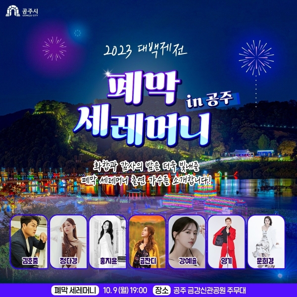 김호중을 비롯해 영기, 정다경, 홍지윤, 강예슬, 문희경 그리고 트로트의 여제 금잔디까지 한자리에 모여 대장정의 마침표를 찍은 뒤 화려한 멀티 불꽃쇼를 보며 내년 제70회 백제문화제를 기약할 예정이다.