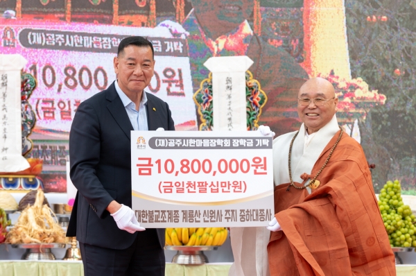 신원사 주지 중하대종사는 최근 진행된 ‘신원사 중악단 명성황후 추모제’ 행사에서 별도의 장학기금 전달식을 하고 최원철 시장에게 1080만원의 장학금을 기탁했다.