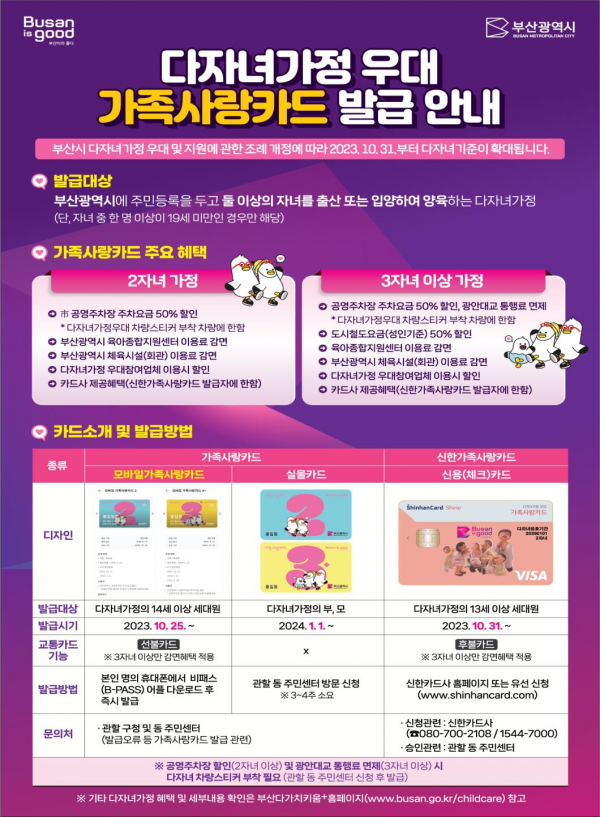 [충청뉴스큐] 부산시는 출산·양육이 행복한 선택이 될 수 있는 사회환경 조성을 위해 오는 10월 31일부터 다자녀가정 기준을 2자녀까지로 확대하고 리뉴얼 가족사랑카드 발급을 시작한다고 밝혔다.