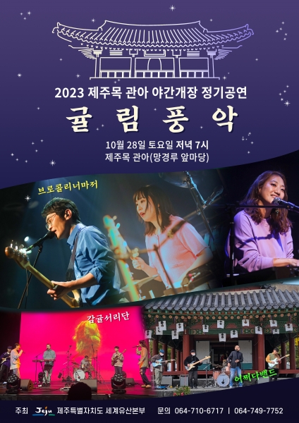 이어서 오후 7시부터 제주목 관아 야간개장 정기공연 ‘귤림풍악’의 하이라이트 무대로 ‘브로콜리너마저’, ‘감귤서리단’, ‘어쩌다밴드’의 콘서트 공연이 망경루 앞마당에서 열린다.