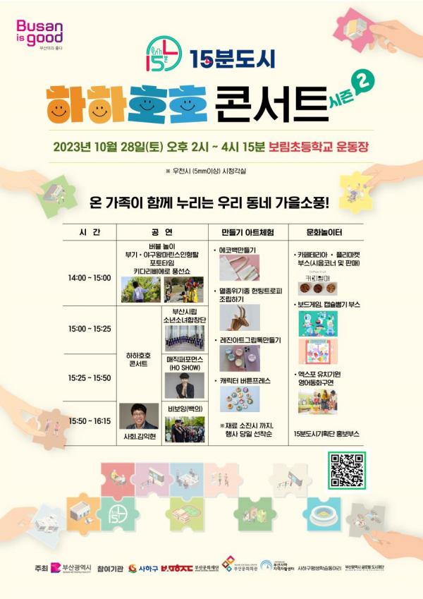 [충청뉴스큐] 부산시는 오는 10월 28일 오후 2시 사하구 보림초등학교 운동장에서 ‘15분도시 하하호호 콘서트시즌2’를 개최한다고 밝혔다.