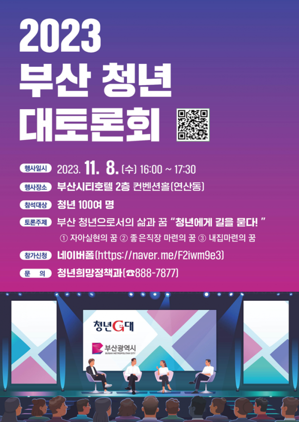 [충청뉴스큐] 부산시는 오는 11월 8일 오후 4시, 부산시티호텔 컨벤션홀에서 ‘2023 부산 청년 대토론회’를 개최한다고 밝혔다.