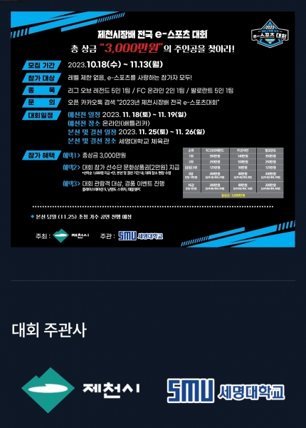 [충청뉴스큐] 오는 11월 25일 ~ 26일 2일간 세명대 체육관에서 개최하는 2023 제천시장배 전국 e-스포츠 대회 관심이 벌써부터 뜨겁다.