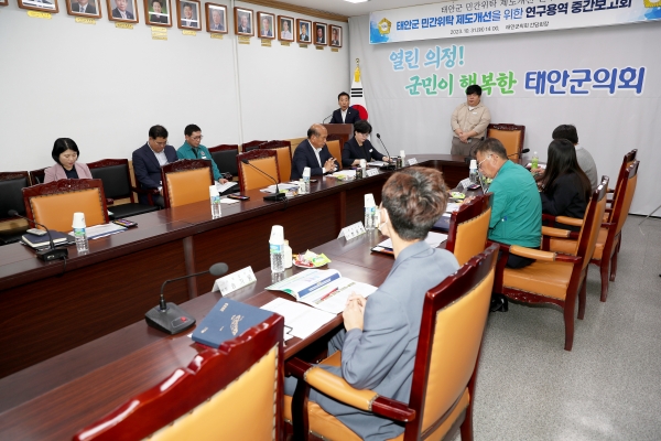 [충청뉴스큐] 태안군의회 “민간위탁 제도개선 연구회”는 지난 10월 31일 태안군의회 간담회장에서 한국민간위탁경영연구소 및 태안군 관계 공무원들이 참석한 중간보고회를 개최하고 본격적인 연구활동을 돌입했다.