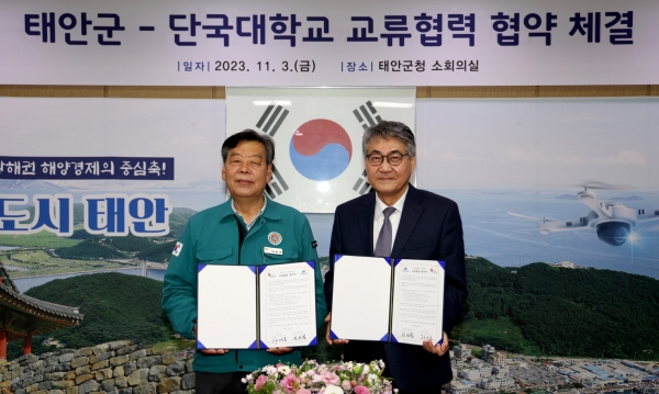 군은 3일 군청 소회의실에서 가세로 태안군수와 단국대 안순철 총장 및 백동헌 산학협력단장 등이 참석한 가운데 ‘태안군-단국대학교 교류협력 협약’을 체결했다고 밝혔다.
