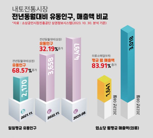 문화관광형 시장 육성사업을 시작한 2021년도 대비 2023년도의 유동인구는 107.24%로 대폭 증가한 것으로 하루 평균 2,327명이 늘어난 수치다.