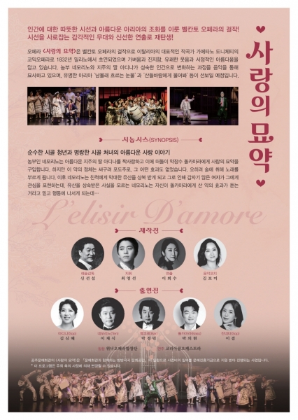 이 공연은 벨칸토 오페라의 걸작으로 이탈리아의 대표적인 작곡가 가에타노 도니체티의 코믹 오페라로 1832년 밀라노에서 초연됐으며 가벼움과, 진지함, 유쾌한 웃음과 서정적인 아름다움을 담고 있어 오래도록 관객에게 사랑을 받아 왔다.