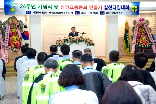 [충청뉴스큐] 새마을교통봉사대 제천지대는 지난 10일 명성유유컨벤션에서 ‘새마을교통봉사대 제천지대 발대 24주년 기념식 및 선진교통문화 만들기 실천 다짐대회’를 개최했다.
