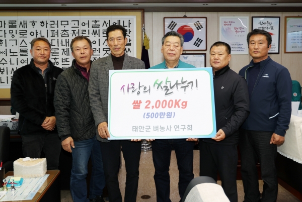 군에 따르면, 태안군벼농사연구회 신양우 회장과 김천중 부회장 등 5명은 지난 21일 군청 군수실에서 가세로 군수 등이 참석한 가운데 기탁식을 갖고 어려운 이웃에 도움을 주고 싶다며 10kg 쌀 200포를 군에 기탁했다.