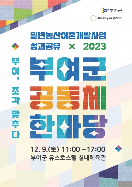 ‘부여, 조각 맞추다’라는 슬로건으로 진행되는 이번 행사는, 다양한 색깔의 조각천들이 모여 하나의 조각보 작품으로 변신하는 것처럼 부여군의 다양한 공동체가 한자리에 모여 자기 지역과 자랑거리를 뽐내면서 서로 다르지만 함께 어우러지는 자리를 통해 1년간의 노고를 격려하며 풀어낼 수 있는 흥겨운 잔치 마당의 형식으로 진행될 예정이라고 한다.