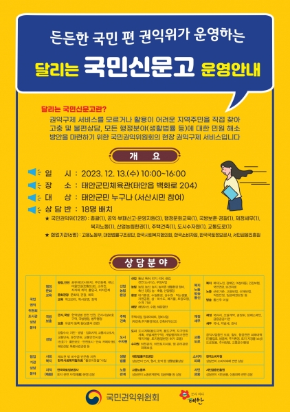 군은 오는 12월 13일 태안군민체육관에서 주민들의 각종 고충사항에 대한 상담을 실시하는 ‘달리는 국민신문고’를 운영한다며 군민들의 많은 관심과 참여를 당부했다.