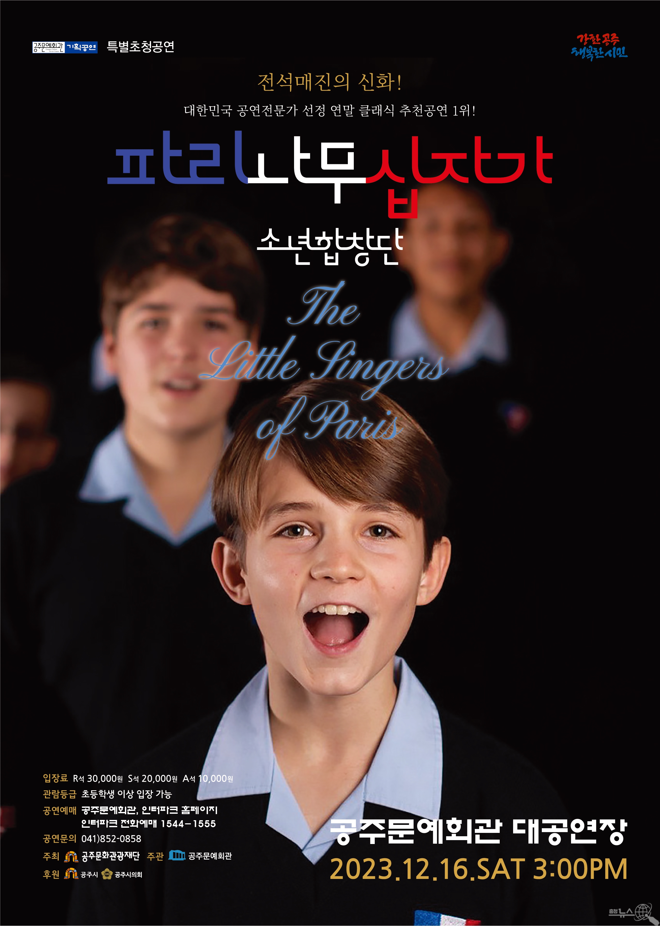 1971년 첫 내한 이래 50년 동안 전석 매진을 기록하며 한국 팬들의 뜨거운 사랑을 받고있는 ‘파리나무십자가 소년합창단’이 오는 16일 공주를 찾는다. ‘파리나무십자가 소년합창단’은 프랑스를 대표하는 문화외교사절로 활약하며 교황 비오 12세로부터 평화의 사도로서의 사명을 부여받아 사랑과 평화를 상징하는 합창단이다. 특히 크리스마스 시즌에 열리는 이번 공연은 평화와 화합의 메시지를 전달하는 무대를 선보일 것으로 기대된다.
