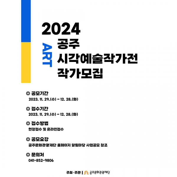 이외 자세한 사항은 공주문화관광재단 홈페이지 공지사항을 확인하면 되고 신청을 원하는 시각 예술인은 관련 양식을 내려받아 작성한 뒤 현장 접수 및 온라인으로 접수하면 된다.