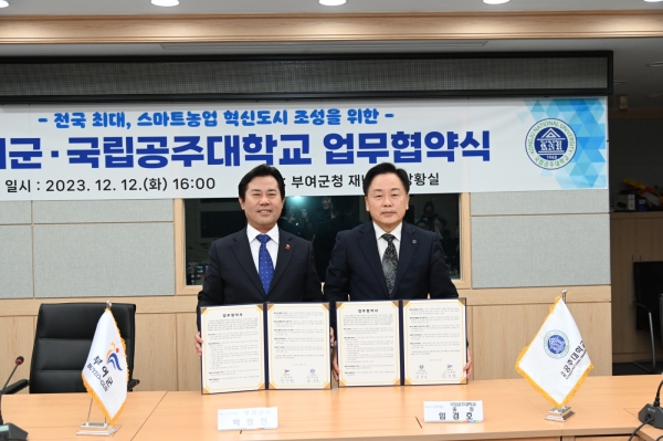 [충청뉴스큐] 부여군은 농업 인구감소, 고령화 및 지역소멸 가속화에 따른 농업환경 변화에 선제 대응하고자 지난 12일 국립공주대학교와 업무협약을 체결했다.