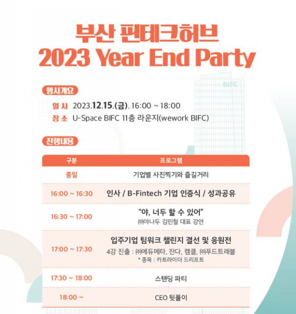 이번 행사는 부산 핀테크 허브 내 입주한 스타트업 기업의 성장을 격려하기 위한 자리로 기업 성과공유 ‘B-Fintech 20’ 기업 인증식 야나두 김민철 대표의 강연 입주기업 팀워크 챌린지 및 네트워킹 등으로 진행될 예정이다.