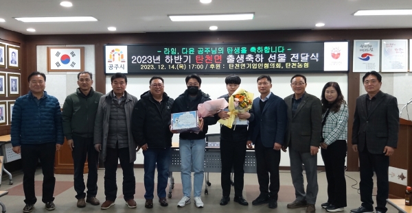 탄천면 기업인협의회 후원으로 진행된 이날 이벤트에서 이정수 회장은 지난 8월 출생한 김다윤 아기의 아버지와 10월 출생한 박라임 아기의 아버지에게 출생 축하 상품권과 꽃다발을 직접 전달했다.