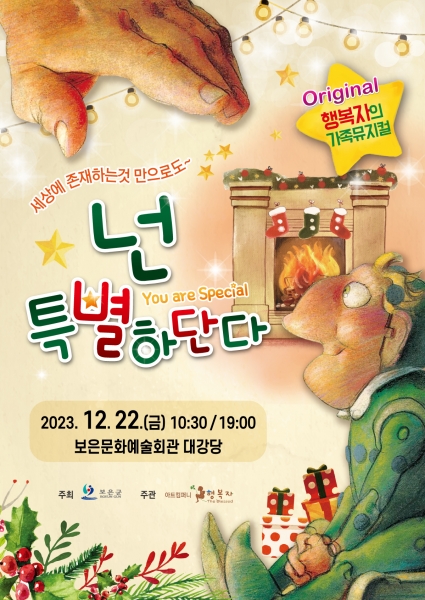 [충청뉴스큐] 보은군은 오는 22일 오전 10시 30분과 오후 7시 등 총 2회에 걸쳐 보은문화예술회관 대강당에서 어린이 뮤지컬‘넌 특별하단다’ 공연을 개최한다고 밝혔다.