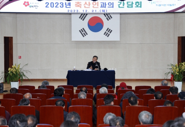 군은 지난 21일 태안군농업기술센터 창조관에서 가세로 군수를 비롯한 군 관계자와 지역 축산농가 관계자 등 200여명이 참석한 가운데 군 농정과 주관 ‘축산인과의 간담회’를 갖고 다양한 의견을 청취했다고 밝혔다.