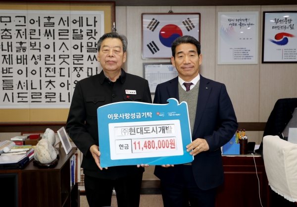 군에 따르면, ㈜현대도시개발은 26일 군청 군수실에서 남근학 대표와 가세로 군수 등이 참석한 가운데 기탁식을 갖고 1148만원의 성금을 군에 기탁했다.
