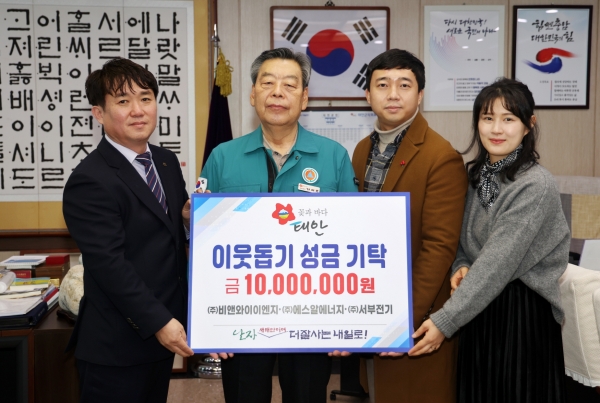 [충청뉴스큐] 충남지역 신재생에너지 업체인 ㈜비앤와이이엔지, ㈜에스알에너지, ㈜서부전기가 태안군에 이웃사랑 성금을 기탁했다.
