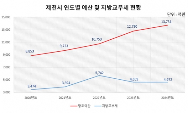 제천시 주요 재정수입을 차지하는 지방교부세는 2020년 3,474억원 2021년 3,924억원 2022년 5,742억원 2023년 4,659억원 2024년 4,672억원이다.