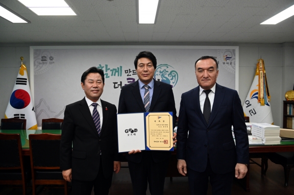 박정현 군수는 대표단을 환대한 후 우즈베키스탄에서 세종학당을 운영하며 부여군과 나망간주 양해각서 체결 등 많은 도움을 주셨던 송인성 학당장을 부여군 해외농업연락사무소사장으로 위촉했다.
