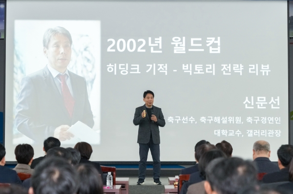 이날 강연은 당시 재치있는 입담으로 경기의 집중력을 고조시켰던 신문선 전 축구해설위원이자 명지대 기록정보과학전문대학원 교수가 맡아 축구 경기와 조직 운영을 빗대어 설명했다.