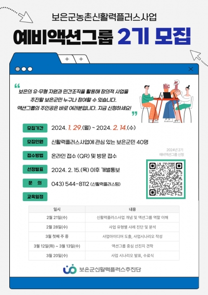 [충청뉴스큐] 보은군은 신활력플러스사업 2기 예비액션그룹 40명을 모집한다고 30일 밝혔다.