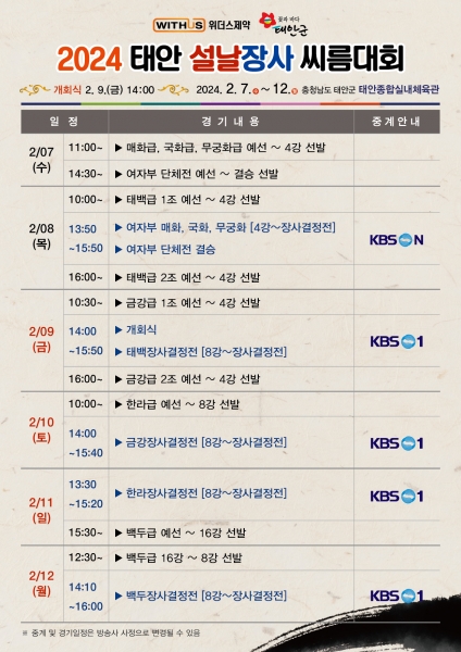 [충청뉴스큐] 오는 2월 7일부터 충남 태안군에서 설 연휴를 맞아 ‘2024 설날장사 씨름대회’가 개최되는 가운데, 태안군이 국민들의 많은 관심을 당부하며 성공적인 대회 개최에 만전을 기하겠다는 의지를 밝혔다.