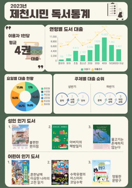 [충청뉴스큐] 제천시립도서관은 지난해 도서관을 방문한 시민들의 이용 현황 데이터를 분석해 ‘2023년 제천시민 독서통계’를 발표했다.
