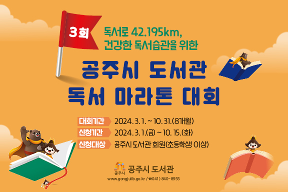 [충청뉴스큐] 공주시는 책 읽는 지역문화 조성을 위해 3월부터 10월까지 240일간 ‘제3회 공주시 도서관 독서마라톤 대회’를 추진한다고 20일 밝혔다.