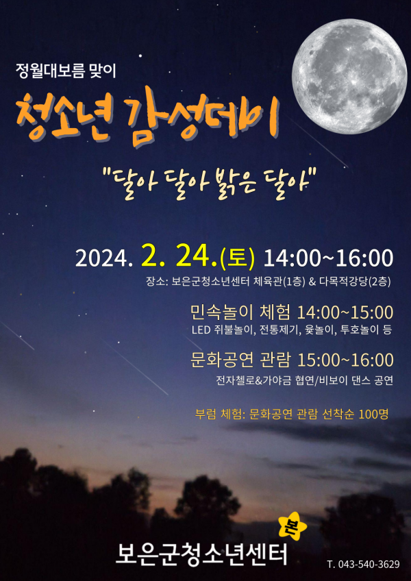 [충청뉴스큐] 보은군청소년센터는 오는 24일 정월대보름을 맞아 군내 청소년을 대상으로 정월대보름 맞이 청소년 감성데이 ‘달아 달아 밝은 달아’ 행사를 개최한다.