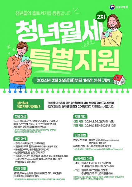 이 사업은 고금리·고물가 등 경제여건 악화로 어려움을 겪는 청년층의 주거비 부담 경감을 위해 정부가 한시적으로 추진한다.