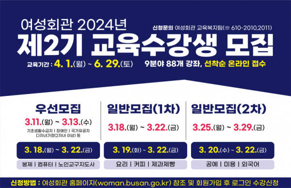 [충청뉴스큐] 부산시 여성회관은 시민들의 취업, 창업 등 경제활동 참여와 직장인 등의 능력개발을 위해 ‘2024년 제2기 교육과정’ 수강생을 오는 3월 11일부터 모집한다고 밝혔다.