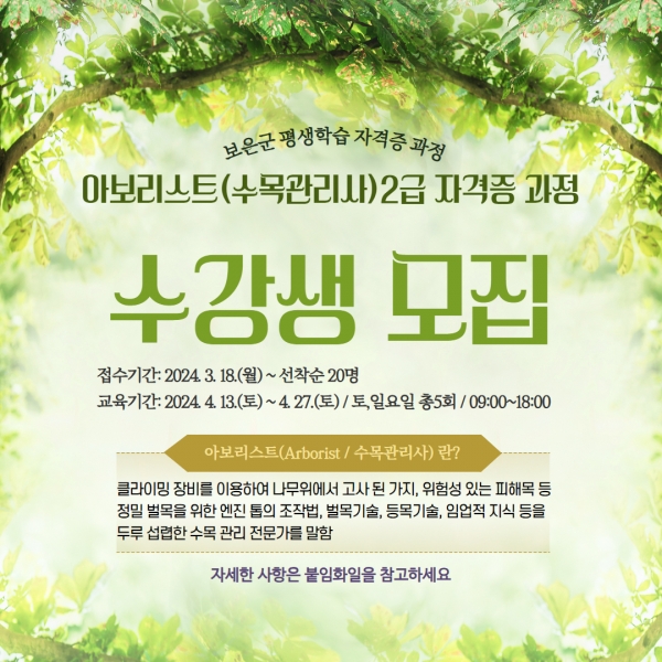 [충청뉴스큐] 보은군은 2024년 수목관리전문가 양성을 위한 평생학습 자격증 수강생을 모집한다고 11일 밝혔다.