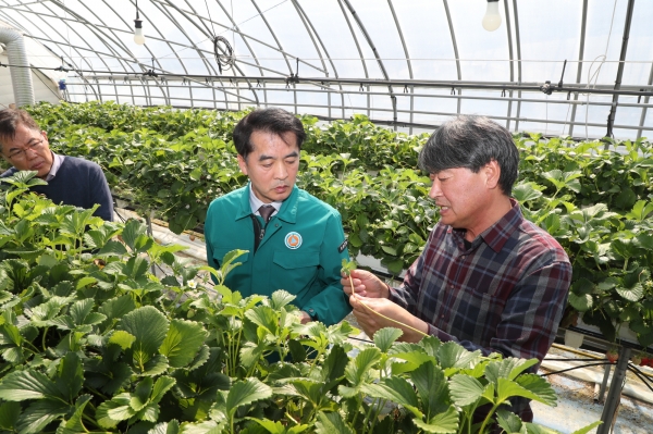 지난 18일 최재형 군수는 관계 부서 직원들과 함께 지속된 흐린 날씨와 강우 등 일조량 부족에 따른 농작물 피해를 입은 딸기 농장을 방문해 피해 상황을 점검하고 농가의 애로사항을 청취했다.