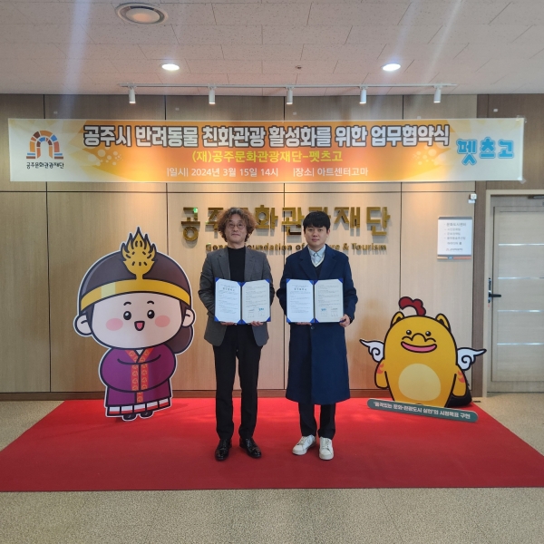 [충청뉴스큐] 공주문화관광재단과 ㈜펫츠고트래블은 공주시의 반려동물 친화관광 활성화를 위해 지난 15일 아트센터 고마에서 업무협약을 체결했다고 밝혔다.