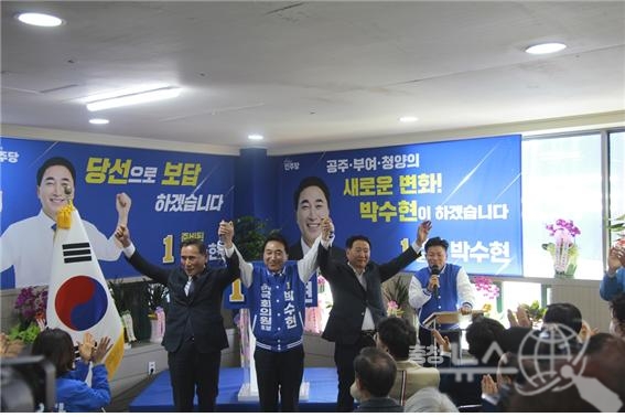 지난 20일 박수현 후보를 지지 선언한 김종관 前 청양군 의원(前 자유한국당, 무소속)과 더불어민주당 선거 경선에서 경쟁후보였던 이종운 前 공주시 의장도 개소식에 함께해 힘을 보탰다.