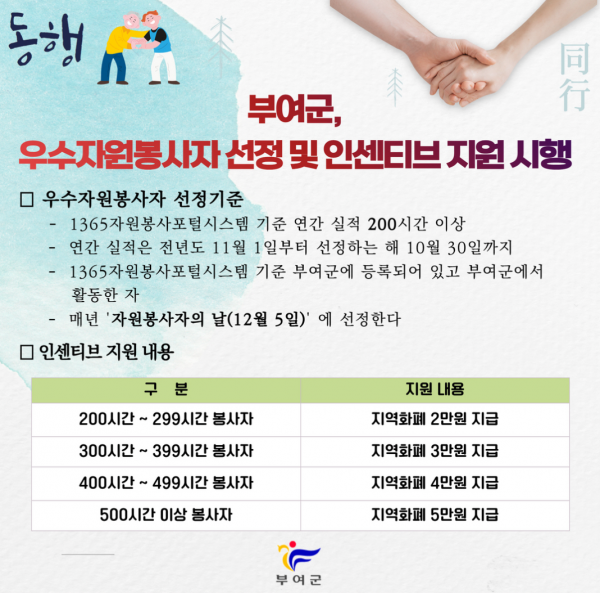 군 관계자는 “인정보상제 지원을 통해 자원봉사에 대한 사회적 가치 활동을 인정하고 자원봉사 문화를 정착시켜 자원봉사 활성화에 기여할 것으로 기대한다”며 “자원봉사활동 참여 전·후에는 봉사시간이 누락되는 일이 없이 부여군자원봉사센터에 상담과 등록을 해 달라”고 당부했다.