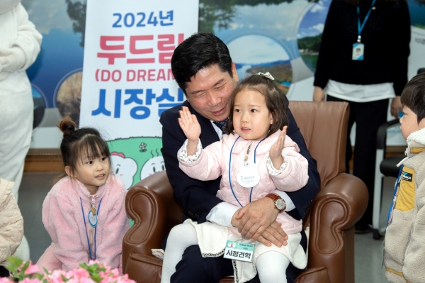 올해 첫 두드림 시장실을 방문한 샛별어린이집 21여명의 원아들은 시장님과 반갑게 인사 후 대화의 시간을 가지고 각 시청부서 체험에 들뜬 모습을 보였다.