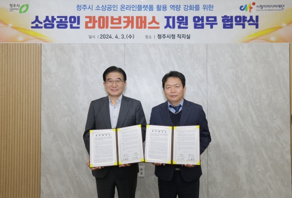 [충청뉴스큐] 청주시는 3일 임시청사 직지실에서 시청자미디어재단과 청주시 소상공인 라이브커머스 지원을 위한 업무협약을 맺었다.