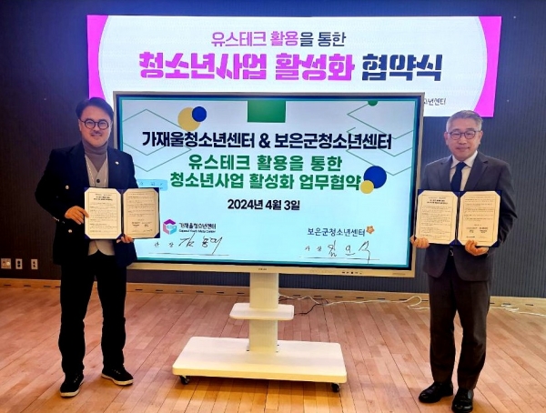 [충청뉴스큐] 보은군청소년센터는 가재울청소년센터와 디지털 기반인 유스테크를 활용한 청소년 사업 활성화를 위한 업무협약을 체결했다고 4일 밝혔다.